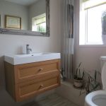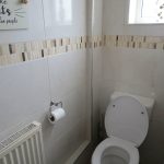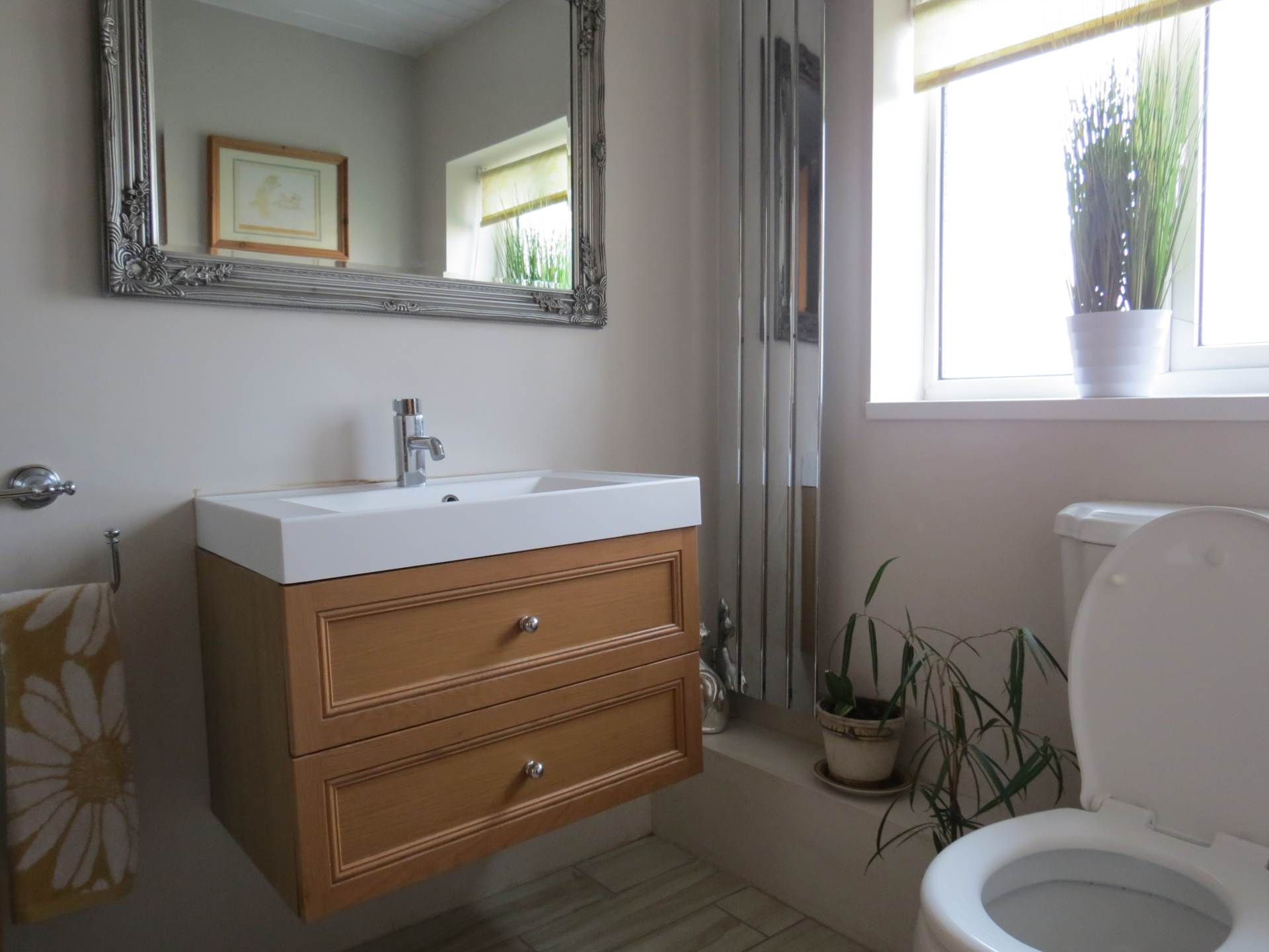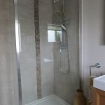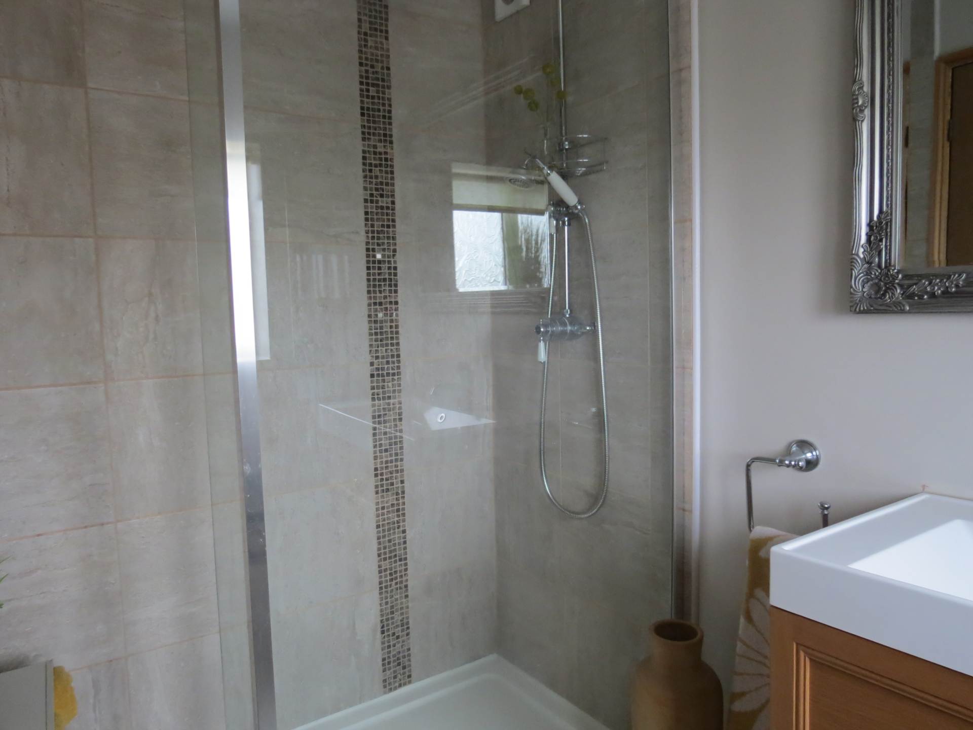 Extended bathroom with fully tiled walls and floor, sink with vanity unit, low level w/c, mixer shower and tray with glass screen.