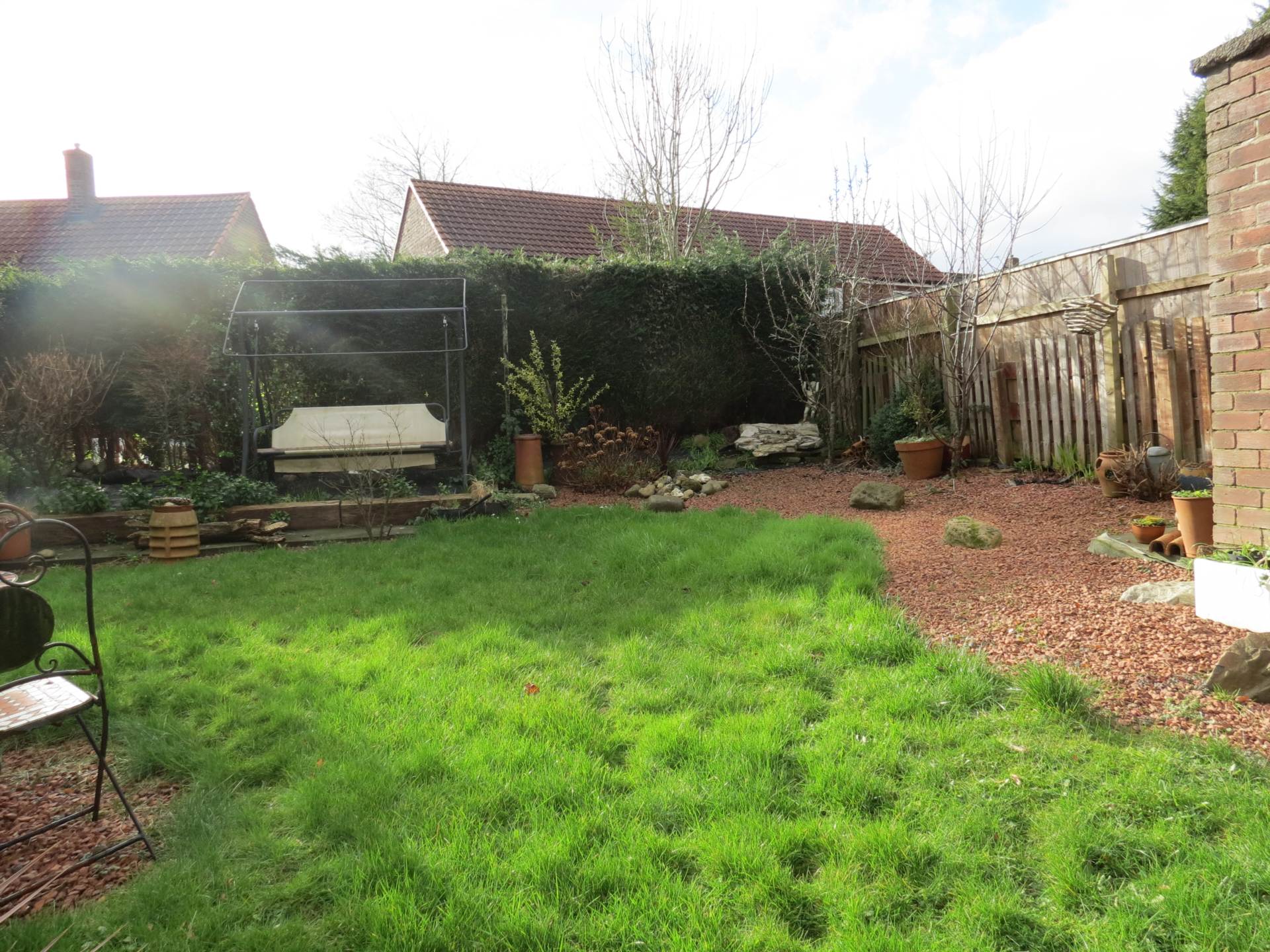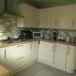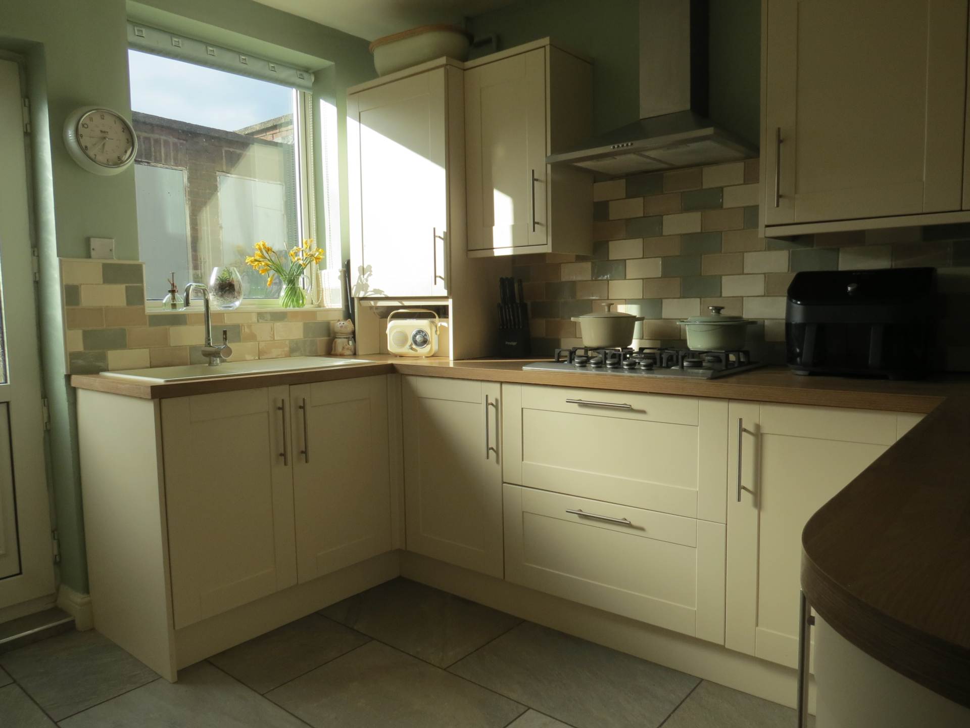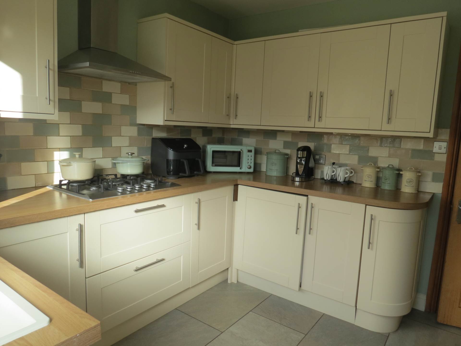 Fitted with cream base and wall units with contrasting work tops, cream resin sink with stainless steel mixer tap, integrated fridge freezer, double oven, 5 burner hob with extractor fan, UPVC door to garden.