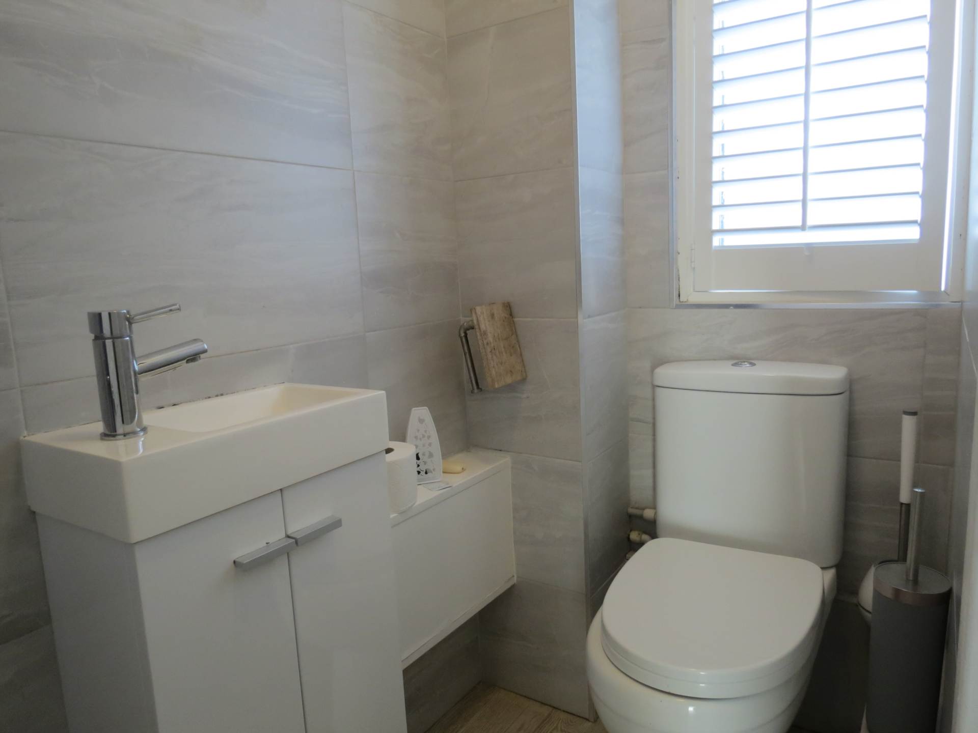 low level WC, hand basin with vanity sink unit, heated towel rail, window to the front