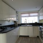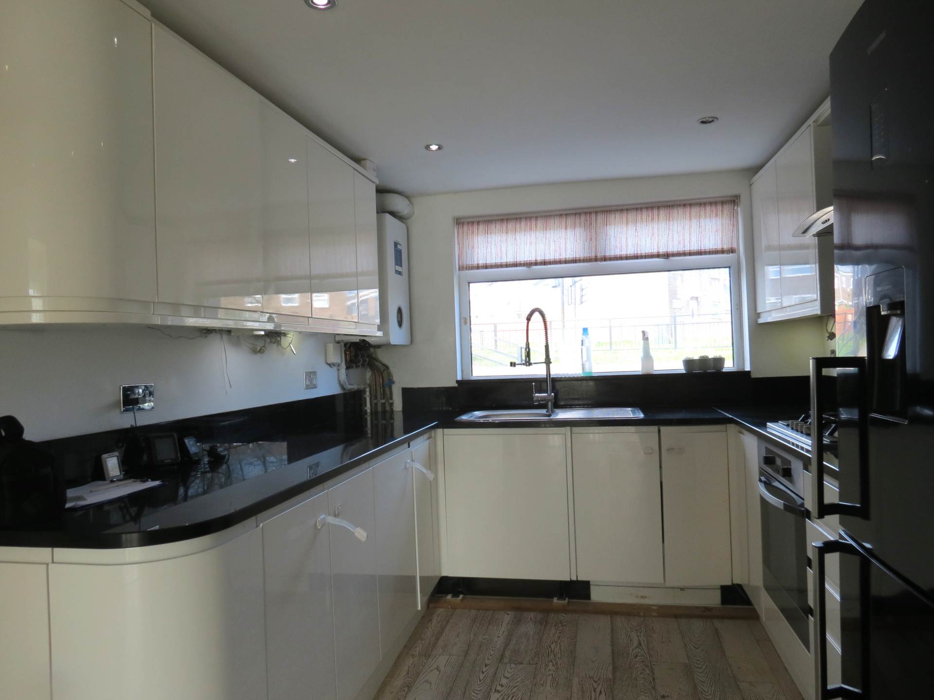 High gloss fitted wall and floor units, granite worktops, electric oven and gas hob, stainless steel sink/drainer, stainless steel mixer tap,radiator, boiler, window to the front.